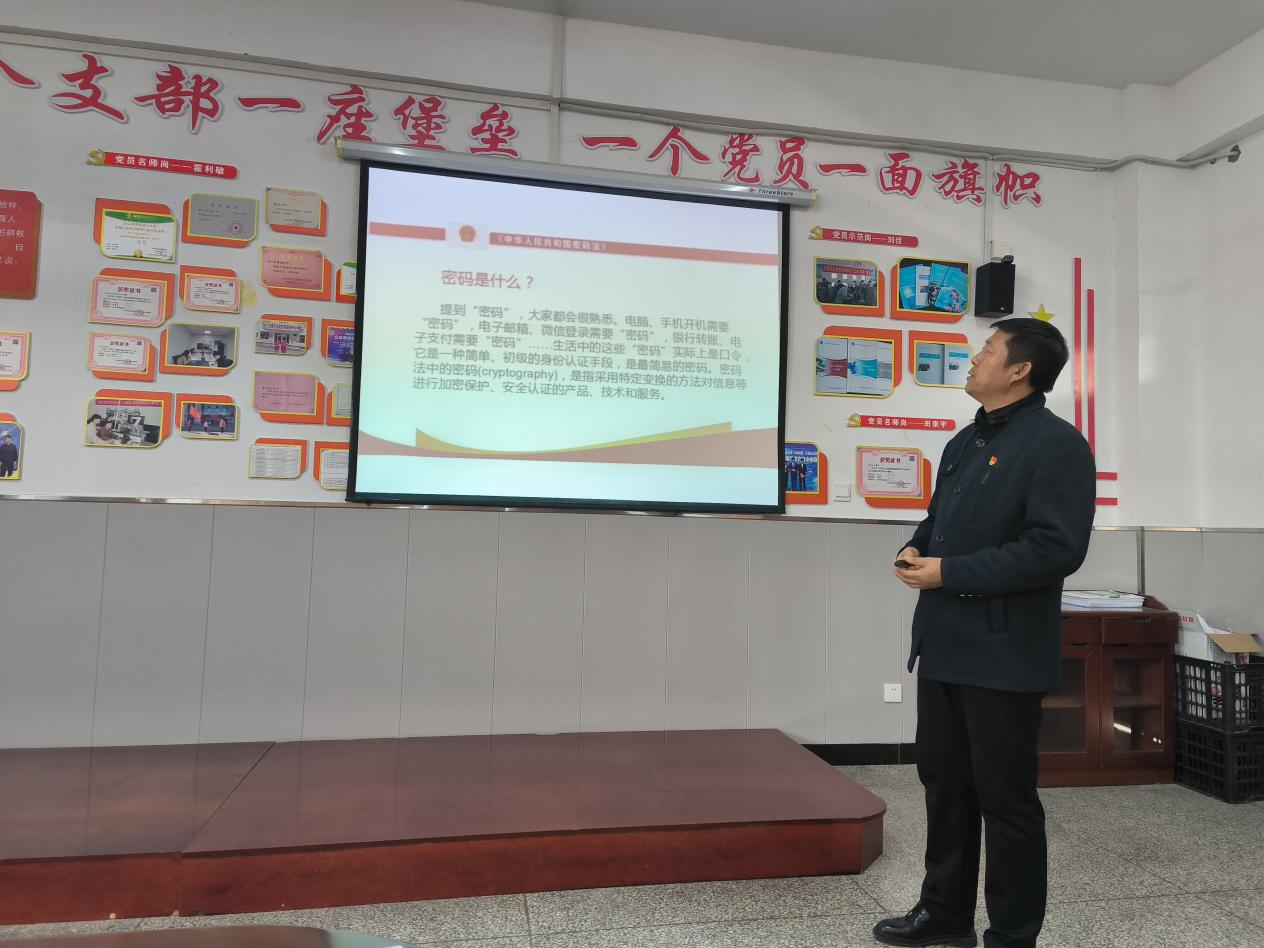本次主題黨日活動組織全體黨員觀看了《百姓身邊的密碼》視頻,黨支部副書記王建斌同志從國家安全角度出發(fā),以《密碼法知識》為主題,從密碼工作的創(chuàng)建、密碼是什么、密碼的功能、密碼的類別、密碼法的立法目的和內(nèi)容等方面展開講解,引導(dǎo)黨員教師全面了解了密碼法,深刻領(lǐng)會了密碼在維護國家安全、促進經(jīng)濟社會發(fā)展、保障人民群眾利益中的重要作用。