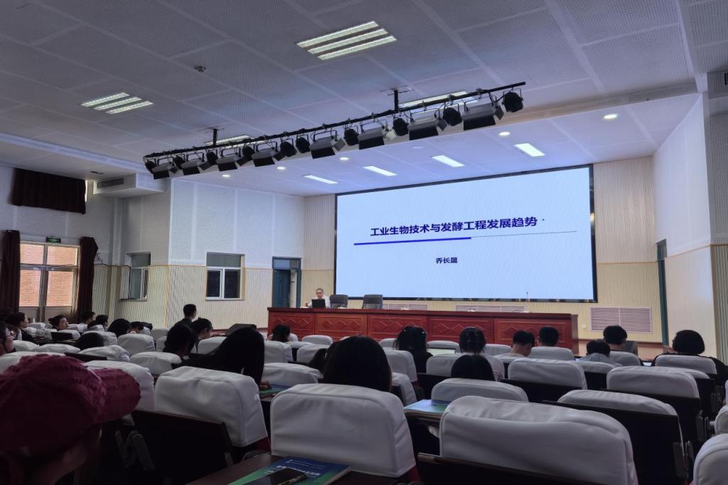 最后,喬長晟教授以《工業(yè)生物技術(shù)與發(fā)酵工程發(fā)展趨勢(shì)》為師生開展術(shù)講座,他結(jié)合全球產(chǎn)業(yè)數(shù)據(jù)與典型案例,系統(tǒng)解析了工業(yè)生物技術(shù)的戰(zhàn)略地位及中國從“跟跑”到“領(lǐng)跑”的轉(zhuǎn)型路徑,重點(diǎn)剖析了功能寡肽生物制造、透明質(zhì)酸發(fā)酵工藝等前沿技術(shù),強(qiáng)調(diào)技術(shù)突破與產(chǎn)學(xué)研協(xié)同的重要性,為師生提供了從理論到實(shí)踐的全景視角。