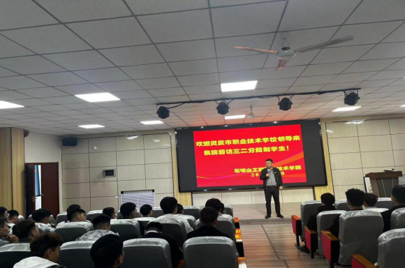 趙校長一行首先看望了靈武市職業(yè)技術(shù)學(xué)校首批“三二分段”合作辦學(xué)轉(zhuǎn)段到我校就讀的41名學(xué)生,了解了學(xué)生的生活、學(xué)習(xí)等情況,要求學(xué)生要珍惜大學(xué)時(shí)光,認(rèn)真學(xué)習(xí),努力奮斗,成就精彩人生。趙校長表示,學(xué)院擁有雄厚的辦學(xué)實(shí)力,優(yōu)良的教師隊(duì)伍及成熟的辦學(xué)模式,雙方自2020年開展“三二分段”培養(yǎng)中高職合作辦學(xué)以來,已為172名學(xué)生提供了學(xué)歷提升的平臺(tái),希望兩校繼續(xù)強(qiáng)化“三二分段”合作辦學(xué),以高職為引領(lǐng),中職為基礎(chǔ)深化交流,共促發(fā)展。張沖副院長就學(xué)院辦學(xué)整體情況、招生就業(yè)、校企合作、課程體系銜接等方面向趙校長一行作了詳細(xì)介紹。她指出兩校要趁著職業(yè)教育的東風(fēng),持續(xù)加強(qiáng)院校合作,落實(shí)中高職業(yè)教育的新政策。