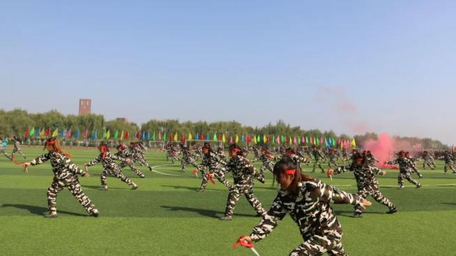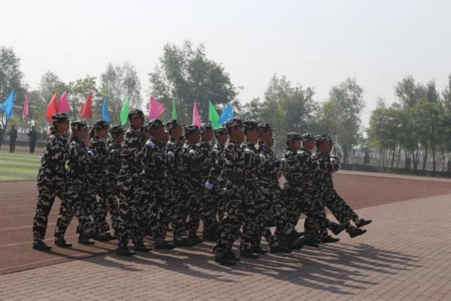 分列式方陣表演結(jié)束,軍事技能表演方陣依次上場(chǎng)展示。擒敵拳方隊(duì)出拳虎虎生威,踢腿凌厲有力,“請(qǐng)黨放心,強(qiáng)國(guó)有我”的口號(hào)響徹云霄;匕首操方隊(duì)動(dòng)作利落、銳不可當(dāng),盡顯女子“柔肩擔(dān)重任”的氣魄;刺殺操方隊(duì)伴隨著激昂的音樂(lè),一突一刺,一防一擊,殺聲震天,豪情滿懷,盡顯男兒時(shí)代風(fēng)采。堅(jiān)定的目光、熱血的嘶吼、整齊的動(dòng)作、飽含著這21天以來(lái)的汗水與成長(zhǎng),展現(xiàn)了工貿(mào)學(xué)子的青春力量。