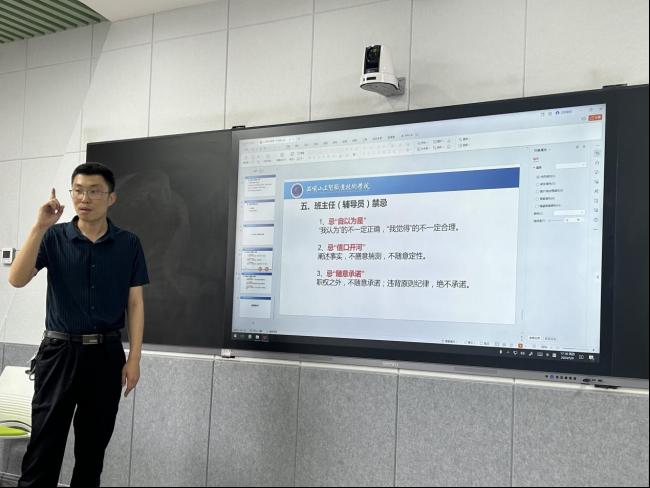 學生處副處長王宇輝以《如何做一名合格的班主任(輔導員)》為主題,結合自身多年的工作經(jīng)驗與新教師分享了學生管理和班級管理的方法和要求、與家長溝通的技巧以及學生突發(fā)事件應對等。分析學生群體呈現(xiàn)出的新特點,指出輔導員、班主任要堅持用習近平新時代中國特色社會主義思想鑄魂育人,做到身體力行示范引領,站穩(wěn)站好輔導員、班主任崗位,牢固樹立責任意識,不斷更新觀念、厘清路徑、創(chuàng)新方法,切實提高思政素養(yǎng)與業(yè)務能力,推動學院學生教育、管理和服務工作高質量發(fā)展。