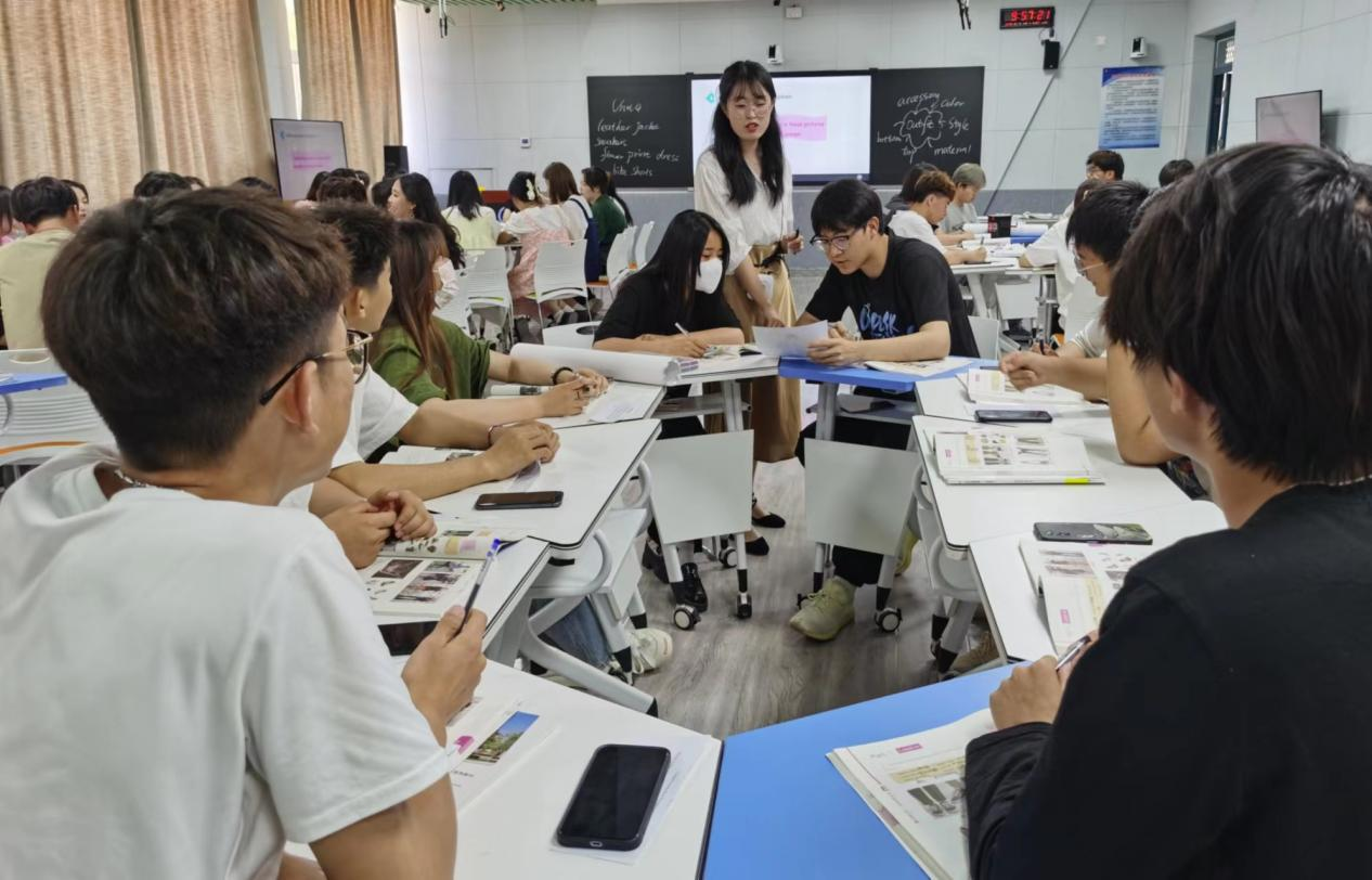 英語教師陳國萍為全體教師呈現(xiàn)了一堂豐富多彩的英語課,授課主題為《Fashion》。她以任務(wù)為導(dǎo)向,設(shè)計(jì)了4個主線任務(wù),由淺入深,層層遞進(jìn)。通過前置設(shè)問、視頻導(dǎo)入、文化背景滲透、頭腦風(fēng)暴等方式,在注重學(xué)生英語語言輸入的基礎(chǔ)上,激活學(xué)生已有知識,為學(xué)生英語口語的輸出做好前期基礎(chǔ)。并以充分的準(zhǔn)備、精美的課件、結(jié)構(gòu)化的板書和信息化手段的融入,展現(xiàn)出師生實(shí)時互動與課堂教學(xué)生成成果,充分體現(xiàn)了有深度、有廣度、有情境的“三有”課堂理念。