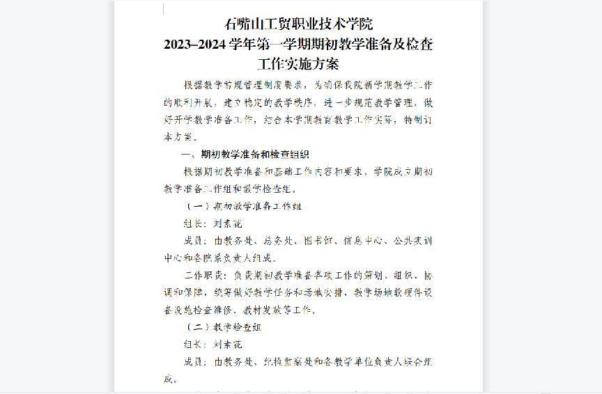 切實抓好新學(xué)期開學(xué)工作,維護正常教育教學(xué)秩序,強化教學(xué)質(zhì)量監(jiān)控,確保新學(xué)期教學(xué)工作扎實推進,學(xué)院精心組織、認真準(zhǔn)備,多措并舉為新學(xué)期教學(xué)工作提供保障。為規(guī)范教學(xué)管理、建立穩(wěn)定的教學(xué)秩序,學(xué)院制定了《石嘴山工貿(mào)職業(yè)技術(shù)學(xué)院2023-2024學(xué)年第一學(xué)期期初教學(xué)準(zhǔn)備及檢查工作實施方案》,對本學(xué)期期初教學(xué)準(zhǔn)備工作統(tǒng)籌部署。