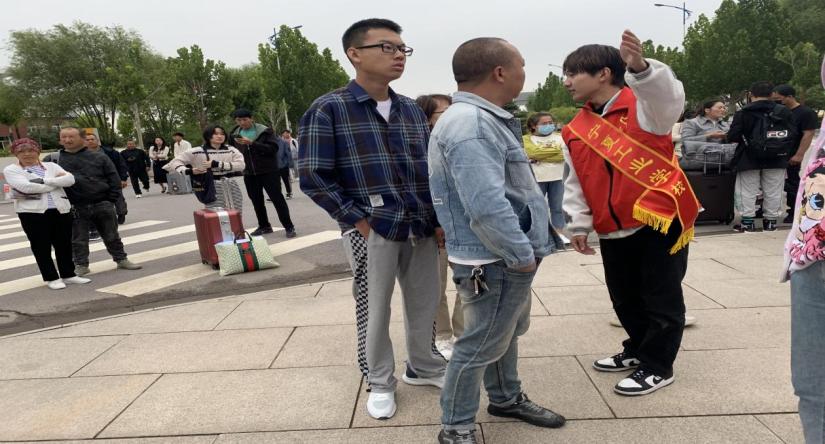 志愿者向家長(zhǎng)介紹新生報(bào)到流程
