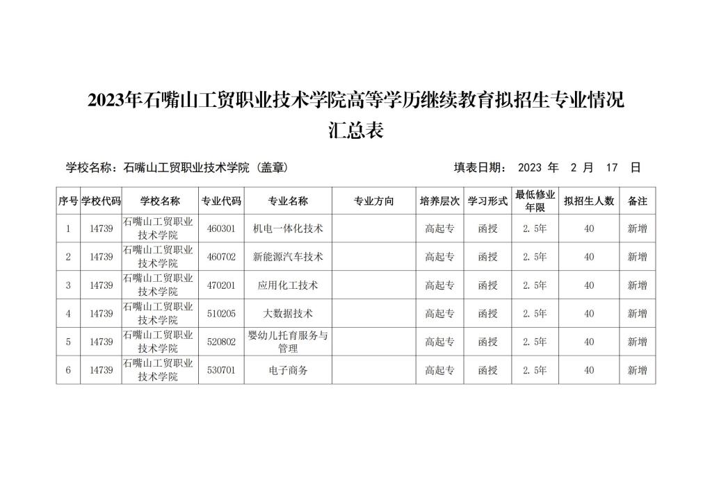 石嘴山工貿(mào)職業(yè)技術(shù)學(xué)院成人大專(zhuān)申辦備案在教育部高等繼續(xù)教育信息管理系統(tǒng)內(nèi)已審批通過(guò)。學(xué)院自2023年開(kāi)始面向社會(huì)招收高等學(xué)歷繼續(xù)教育高起專(zhuān)層次生源?,F(xiàn)將學(xué)院本年度第一批次擬開(kāi)展招生的6個(gè)專(zhuān)業(yè)面向社會(huì)公示。具體專(zhuān)業(yè)情況如下: