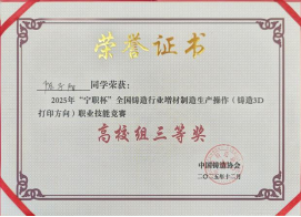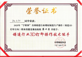 比賽中,石嘴山工貿(mào)職業(yè)技術(shù)學院機械工程系學生陳子陽沉著應戰(zhàn),憑借過硬的實操能力、扎實的理論基礎和出色的臨場應變能力,在數(shù)字化建模、打印工藝規(guī)劃、設備操作及后處理等多個考核環(huán)節(jié)中表現(xiàn)突出,最終以第十名的成績榮獲三等獎并被授予“鑄造行業(yè)3D打印操作技術(shù)能手”稱號,展現(xiàn)了我院學子精湛的技能水平和良好的職業(yè)素養(yǎng)。