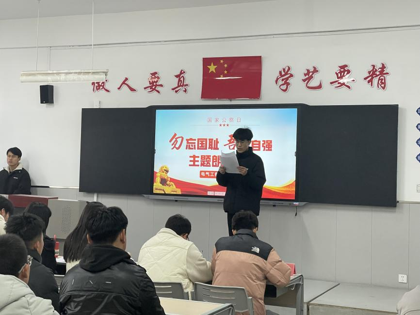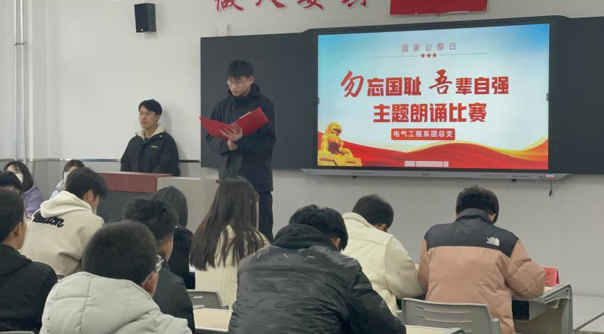 12月13日是第十個(gè)南京大屠殺死難者國(guó)家公祭日,為深入開展“四史”教育,弘揚(yáng)偉大的民族精神和抗戰(zhàn)精神,感受革命英烈堅(jiān)定的理想信念和濃厚的家國(guó)情懷,12月12日下午,電氣工程系團(tuán)總支在二號(hào)樓102教室組織開展“勿忘國(guó)恥 吾輩自強(qiáng)”主題朗誦比賽。