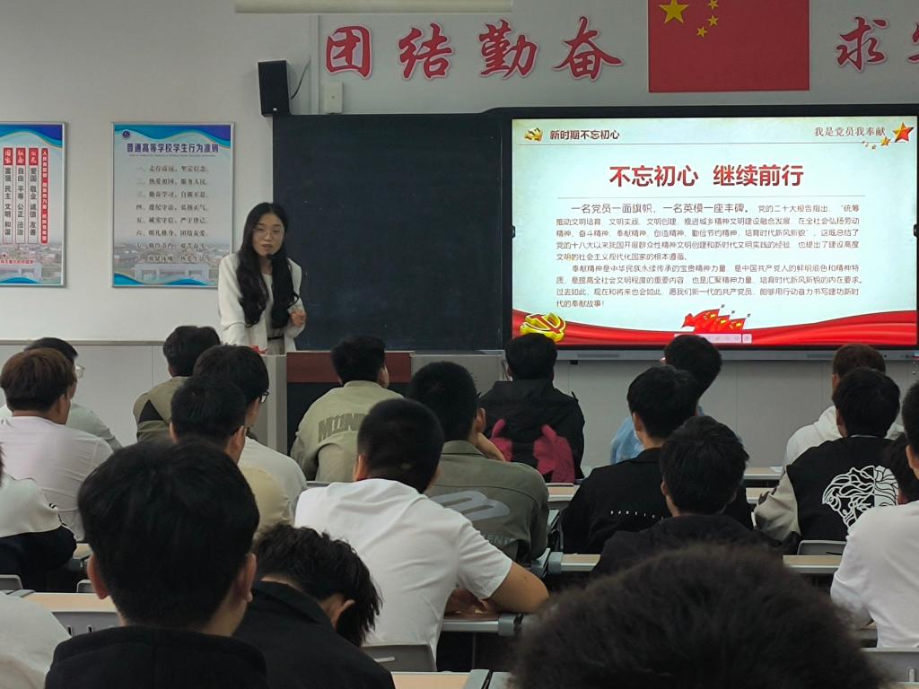 最后,許文婷就新時(shí)期如何不忘初心和同學(xué)們進(jìn)行了探討,通過黨的二十大報(bào)告,引出奉獻(xiàn)精神是中華民族永續(xù)傳承的寶貴精神力量,是中國共產(chǎn)黨人的鮮明底色和精神特質(zhì),是提高全社會(huì)文明程度的重要內(nèi)容,也是匯聚精神力量、培育時(shí)代新風(fēng)新貌的內(nèi)在要求。她說:“一個(gè)人無法延長生命的長度,但可以拓寬生命的寬度?!彼?lì)同學(xué)們要弘揚(yáng)奉獻(xiàn)精神,做馬克思筆下的青年,用行動(dòng)奮力書寫建功新時(shí)代的奉獻(xiàn)故事!