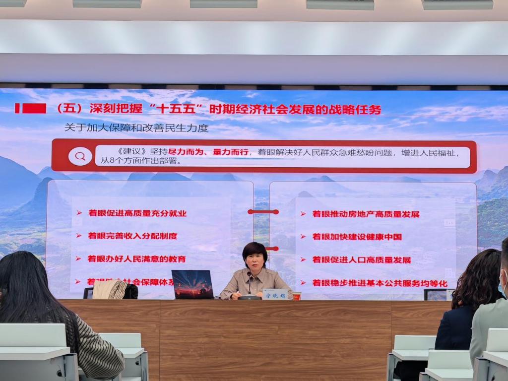 寧曉娟書記緊緊圍繞黨的二十屆四中全會精神,從如何學(xué)、學(xué)什么、怎么干三個方面,帶大家深入學(xué)習(xí)了黨的二十屆四中全會精神實質(zhì),從經(jīng)濟(jì)社會發(fā)展的指導(dǎo)思想、重大原則、主要目標(biāo)等方面進(jìn)行了全面解讀。她強(qiáng)調(diào),全體師生要深刻領(lǐng)會全會精神的豐富內(nèi)涵和核心要義,自覺把思想和行動統(tǒng)一到習(xí)近平總書記重要講話和全會精神上來,堅定信心、凝心聚力、真抓實干。