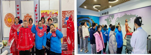 在非遺文化館(龔麗娟非遺剪紙名師工作室),龔麗娟老師為特校學(xué)生詳細(xì)講解了剪紙的歷史淵源、南北流派差異及現(xiàn)代創(chuàng)新應(yīng)用。特校學(xué)生在互動(dòng)環(huán)節(jié)中試穿以剪紙紋樣為靈感的創(chuàng)意服裝,試戴創(chuàng)意頭飾、觸摸剪紙油傘,感受傳統(tǒng)文化的現(xiàn)代演繹。