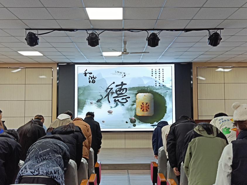 本次道德講堂分為自我反省、聽歌曲、看短片、誦經(jīng)典、學(xué)模范、談感悟、向“德”字鞠躬七個(gè)環(huán)節(jié)。通過自我反省,讓同學(xué)們在閉目自省中接受心靈的洗禮,引導(dǎo)同學(xué)們在學(xué)習(xí)、生活中自覺遵守校規(guī)校紀(jì),養(yǎng)成良好的行為規(guī)范,傳播文明知識(shí),頌揚(yáng)文明行為;聆聽倡導(dǎo)文明新風(fēng)的《公民道德歌》,引導(dǎo)大家努力實(shí)現(xiàn)精神之美、行為之善;觀看全國道德模范感人故事,學(xué)習(xí)無私奉獻(xiàn)、為人民服務(wù)的優(yōu)秀品質(zhì);誦讀《道德經(jīng)》經(jīng)典名句,倡導(dǎo)大家從小事做起,做明大德、守公德、嚴(yán)私德的時(shí)代新人;觀看世界地球日宣傳短視頻,動(dòng)員同學(xué)們要積極踐行綠色低碳生活方式。接下來,大家結(jié)合學(xué)習(xí)內(nèi)容暢談個(gè)人所思所想所悟,參會(huì)人員感慨,一個(gè)社會(huì)文明有序,既靠先善其身的私德,也離不開相善其群的公德。最后,全體學(xué)生滿懷對高尚社會(huì)公德的追求,向“德”字深深鞠躬。