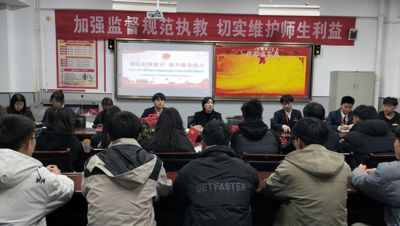 承前啟后展新貌,繼往開來譜新篇。在“德技雙馨”校訓(xùn)的引領(lǐng)下,機械工程系一直以培養(yǎng)學(xué)生自主自律意識,提高學(xué)生自我管理能力,提升學(xué)生自我發(fā)展?jié)撃転槟繕?biāo),全面開展學(xué)生工作。為激勵學(xué)生會干部的榮譽感和責(zé)任心,11月17日晚,機械工程系團委組織開展了2024-2025學(xué)年學(xué)生會干部就職宣誓儀式暨作風(fēng)建設(shè)專題培訓(xùn)。系團委書記呂睿老師主持會議,系學(xué)生會全體成員參加了本次活動。