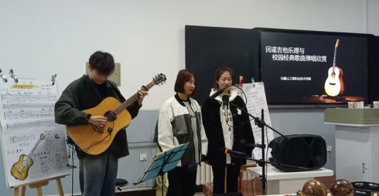 美育類選修課程《民謠吉他樂理與校園經(jīng)典歌曲彈唱欣賞》,教師在教授樂理知識的同時,還講授了撥弦,輕彈等基本動作,學(xué)生們都認真地聆聽、參與、學(xué)習(xí),激發(fā)了學(xué)生學(xué)習(xí)的興趣,也拉近了學(xué)生和教師之間的距離。