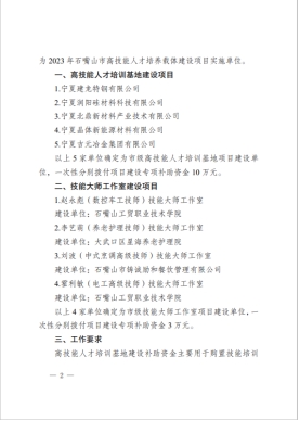近日,中共石嘴山市委人才工作領(lǐng)導(dǎo)小組辦公室與石嘴山市人力資源和社會保障局聯(lián)合發(fā)布《關(guān)于確定2023年石嘴山市高技能人才培養(yǎng)載體建設(shè)項目實施單位的通知文件,學(xué)院趙永彪(數(shù)控車工技師)技能大師工作室和霍利敏(電工高級技師)技能大師工作室均立項市級技能大師工作室建設(shè)項目。