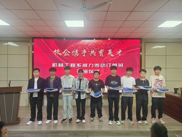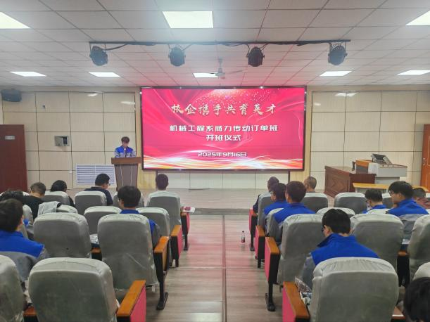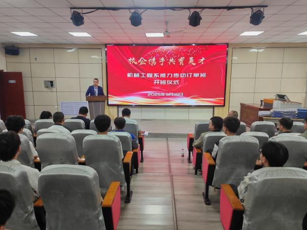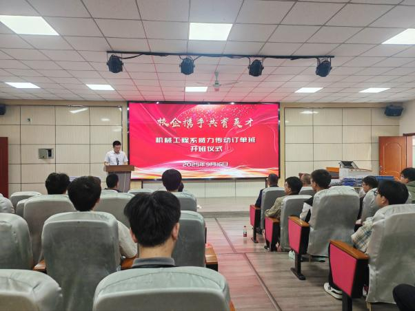 機械工程系主任蘭晏文在致辭中回顧了首屆訂單班的豐碩成果,他表示,訂單班培養(yǎng)是雙方深化產教融合、協(xié)同育人的重要里程碑,旨在共同培養(yǎng)貼合高端裝備制造產業(yè)需求的高素質技術技能人才。同時,他向新一屆“威力傳動訂單班”學子提出三點殷切期望:一要珍惜“學生”與“準員工”的雙重身份,以企業(yè)標準嚴格要求自己;二要錨定“技能核心”,深耕機械設計、傳動系統(tǒng)調試等關鍵技術;三要涵養(yǎng)“職業(yè)素養(yǎng)”,成長為懂技術、懂行業(yè)的復合型人才。企業(yè)代表周亮在致辭中表示,公司將全力支持訂單班建設,通過提供實踐平臺、技術導師和優(yōu)質資源,與學院共同打造一條高效的人才輸送通道,實現(xiàn)學生、學校與企業(yè)三方共贏。