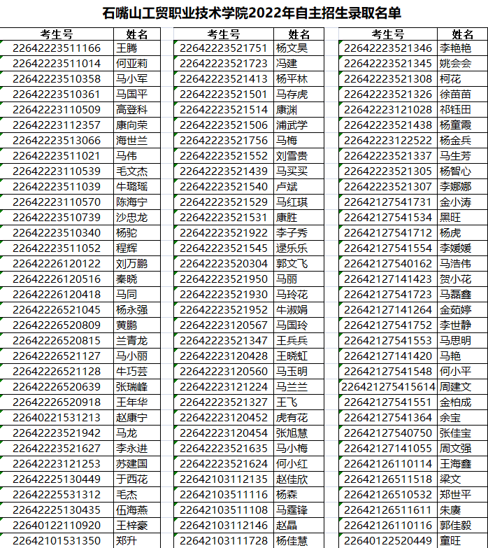石嘴山工貿(mào)職業(yè)技術(shù)學(xué)院2022年自主招生工作已結(jié)束。經(jīng)寧夏回族自治區(qū)教育考試院審核復(fù)驗通過,以下同學(xué)被正式錄取,現(xiàn)予以公示,名單如下: