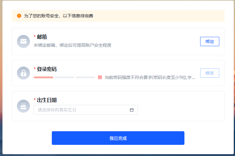 按照網(wǎng)絡(luò)信息安全相關(guān)要求,請(qǐng)各位考生按照要求綁定電子郵箱、修改密碼、出生日期。
