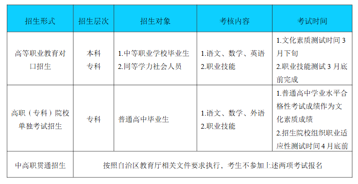 高職對口招生面向中等職業(yè)學(xué)校畢業(yè)生招生,考生須參加高職對口招生考試報名;高職單招面向普通高中畢業(yè)生招生,考生須參加普通高校招生考試報名;中高職貫通招生按照自治區(qū)教育廳相關(guān)文件要求執(zhí)行,考生不參加上述兩項考試報名。